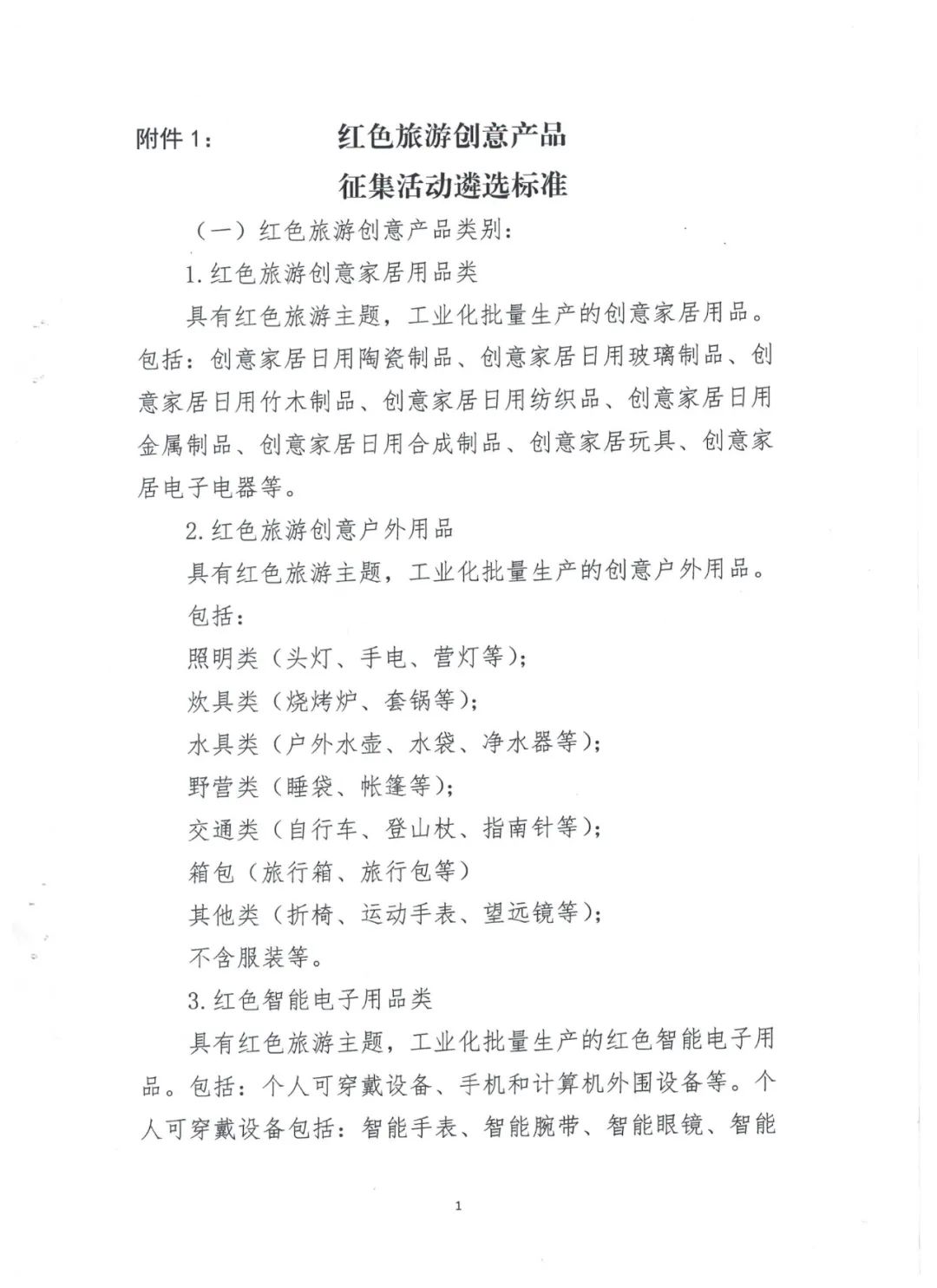 (二)红色旅游好创意户外用品:具有红色旅游主旨,工业化批量生产的好创意户外用品,具有红色旅游主旨,工业化批量生产的好创意户外用品。包括:照明类(头灯、手电、营灯等)、炊具类(烧烤炉、套锅等)、水具类(户外水壶、水袋、净水器等)、野营类(睡袋、帐篷等)、交通类(自行车、登山杖、指南针等)、箱包(旅行箱、旅行包等)、其他类(折椅、运动手表、望远镜等);不含服装等。