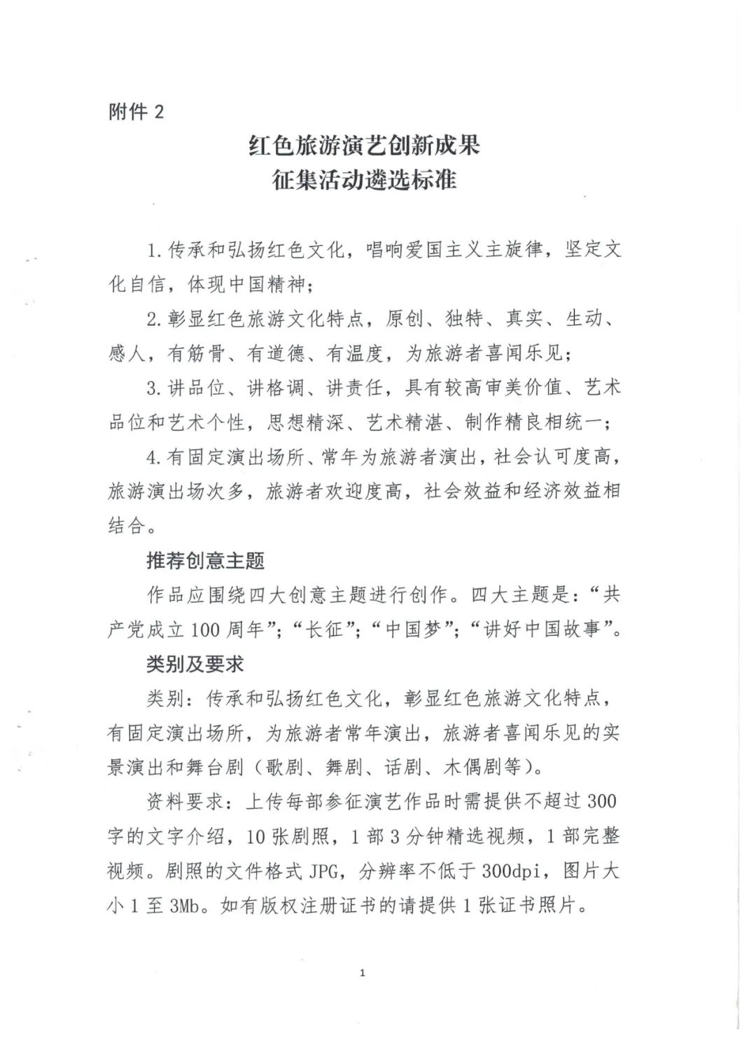 类别及要求:传承和弘扬红色文化,彰显红色旅游文化特点,有固定演出场所,为旅游者常年演出,旅游者喜闻乐见的实景演出和舞台剧(歌剧、舞剧、话剧、木偶剧等)。