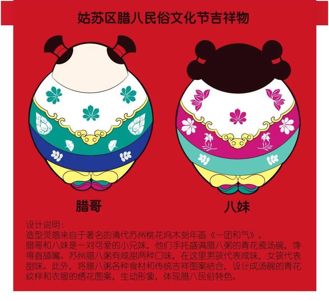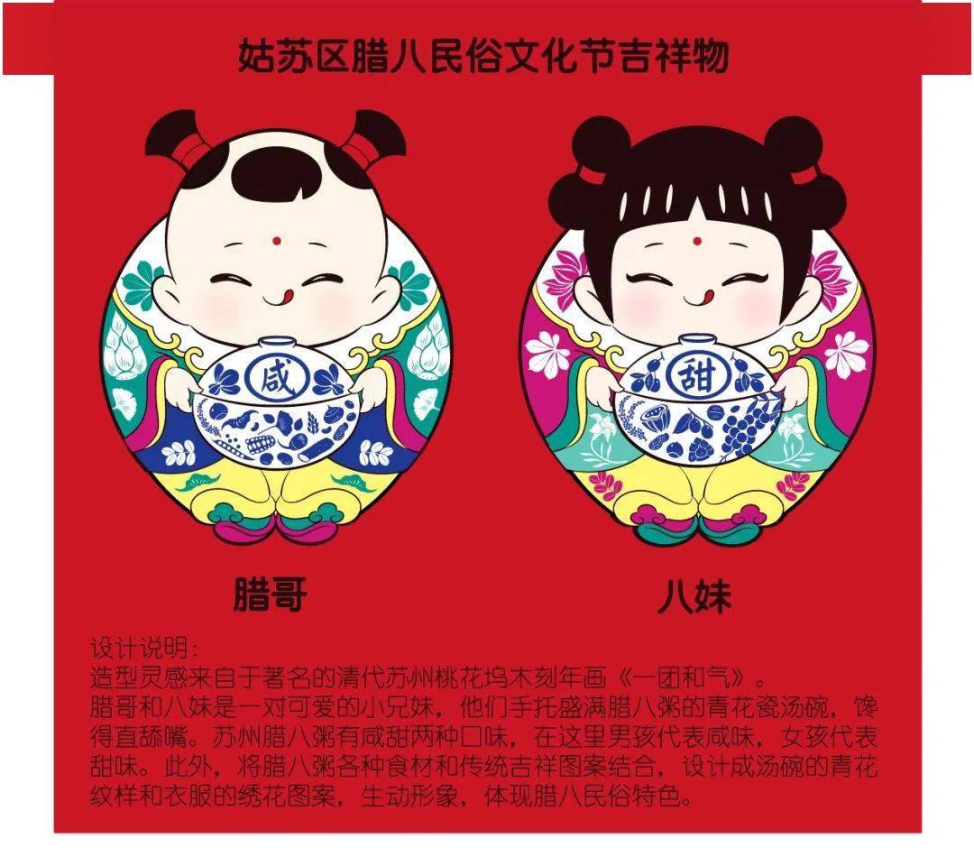 作为“姑苏七宝”之一的“腊八”民俗文化具有悠久的历史和广泛的影响力。2018年,经过社会征集、评审委员会评选、拟获奖作品公布、社会监督以及二度创作等环节,“腊八”民俗文化节吉祥物“腊哥”“八妹”正式亮相。为进一步扩大活动影响力,开发利用“腊哥八妹”特色形象,提升品牌文化魅力,秉承集思广益、众筹智慧的原则, 现面向社会公开征集“腊哥八妹”文创产品好创意设计 。