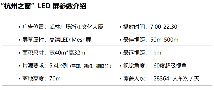 以武林广场 “杭州之窗”LED大屏为创作及呈现载体,为指定的著名企业或其产品提供专属的宣传画面设计、视频动画设计,充分利用杭州之窗本身属性和特色,以新颖、好创意的展现形式突出企业品牌形象或产品特性。