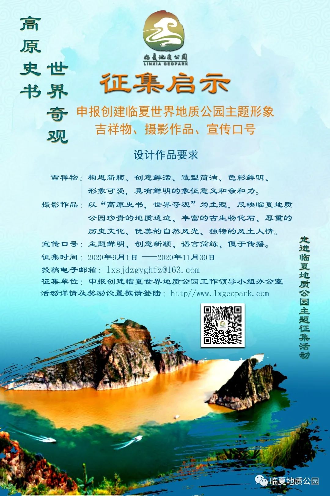 本次征集活动范围面向全社会,号召所有热爱、关心、支持、宣传临夏地质公园的单位、专业设计团队、全国各类院校师生及个人均可参加。