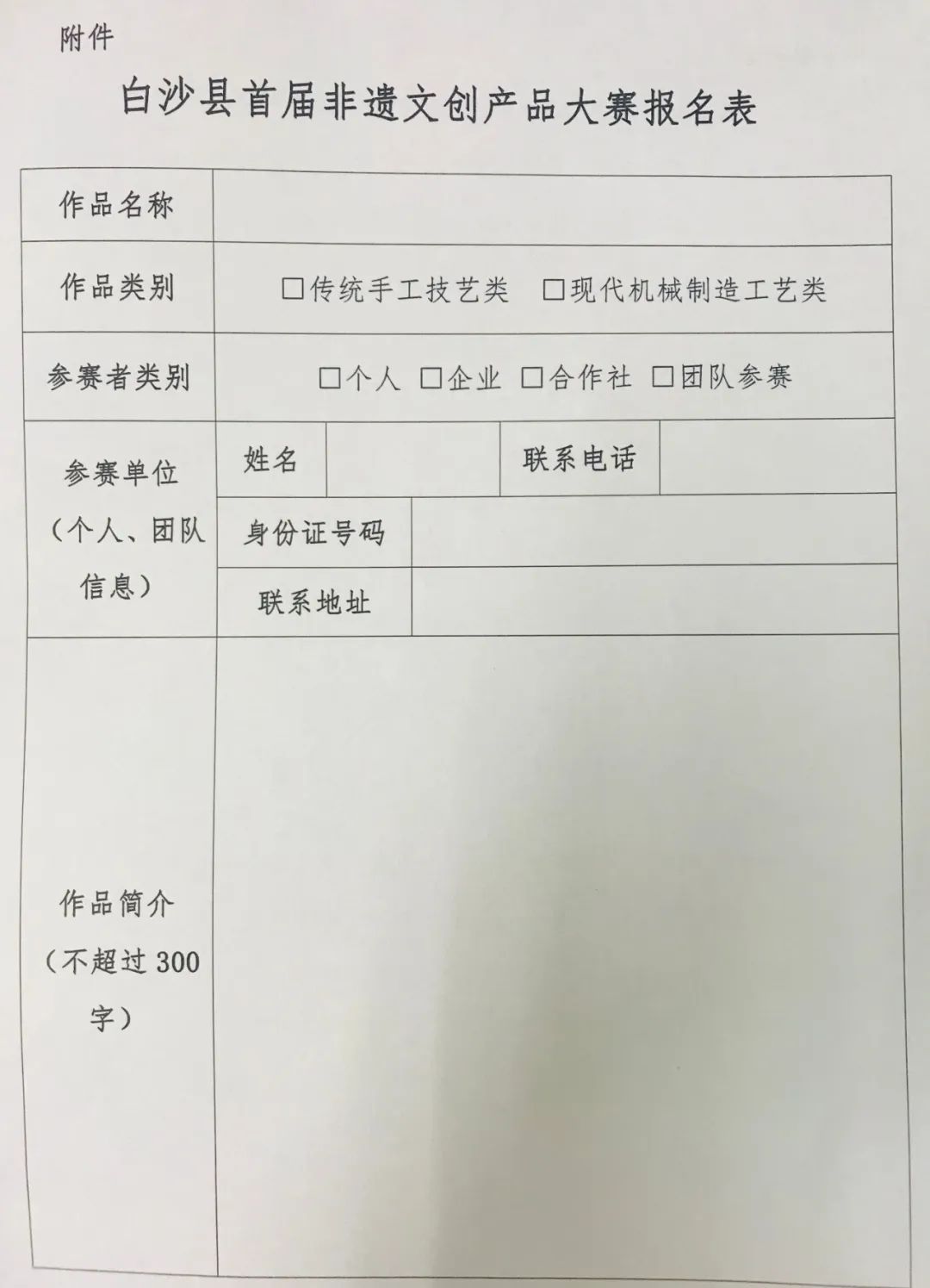 1.参赛人员必须如实填写《白沙县首届非遗文创产品大赛报名表》,提交至县文化馆办公室,或者发送至邮箱baishawhg472@163.com,信息错填或未填写联系方式导致无法联络的,责任由参赛者自行承担。