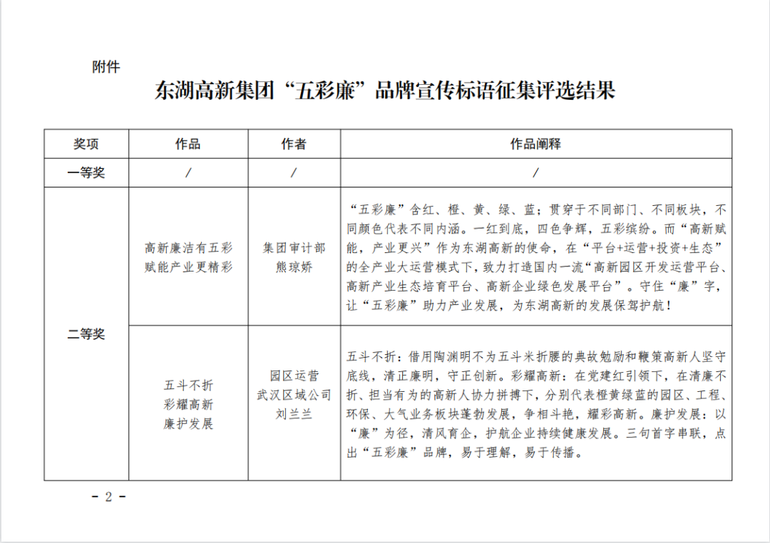 关于湖北联投东湖高新集团“五彩廉”品牌宣传短语征集评选结果的通报