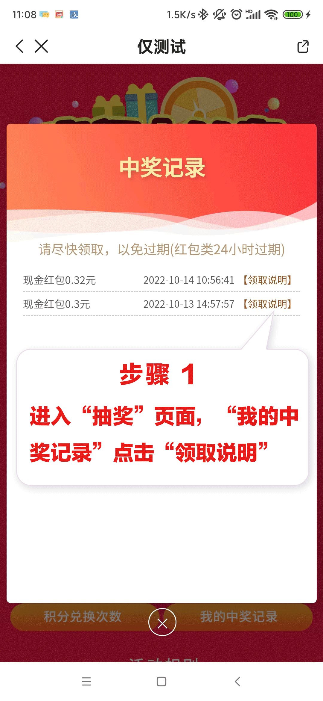 ①进入“抽奖”页面 > 我的中奖记录 > 领取说明