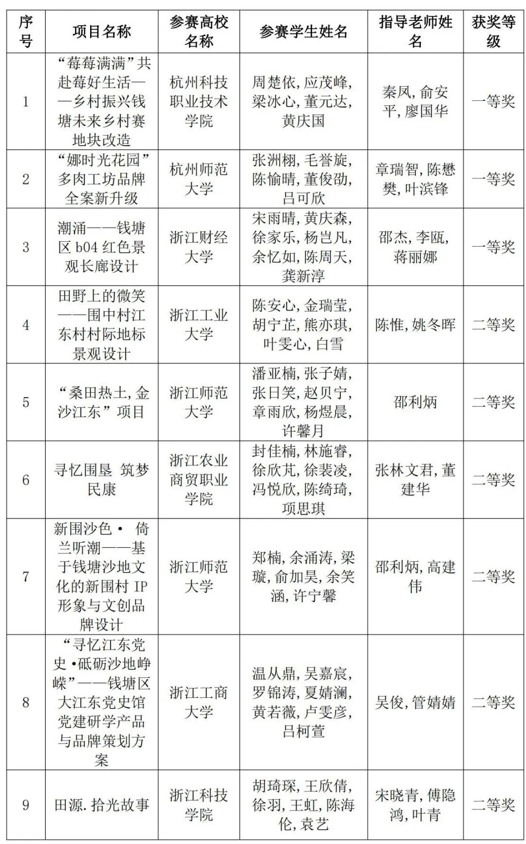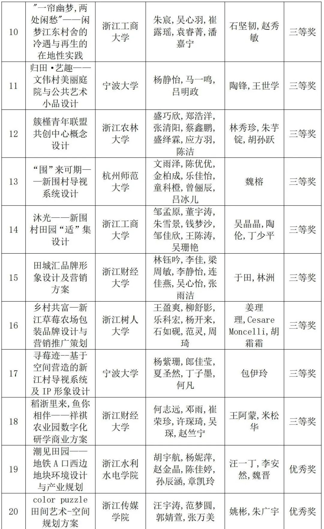 2023年3月18日—3月19日,“建行裕农通杯”第五届浙江省大学生乡村振兴创意大赛钱塘未来乡村专项赛决赛在钱塘区江东村举办,经专家评审,共评出一等奖3项,二等奖6项、三等奖9项,优秀奖12项,现予公示。如有疑议或参赛信息有误,请于公布之日起5天内向竞赛秘书处邮箱(xczxds @zufe.edu.cn)提交材料, 如有必要将提请竞赛监察与仲裁组复议。