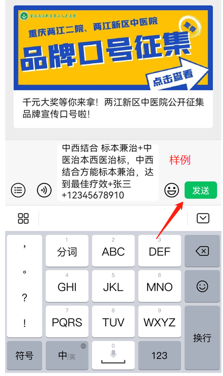 第三步:点击键盘标识,输入您的作品(参照格式:口号+释义+姓名+手机号码),确认无误后点击“发送”即可。