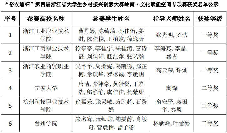 “裕农通杯”第四届浙江省大学生乡村振兴创意大赛岭南·文化赋能空间专项赛决赛于 年 1 月 11 日—1 月 12 日在绍兴市上虞区岭南乡举行,经大赛专家组验收及评审,共评出一等奖 3 项,二等奖 6 项,三等奖 9 项,优秀奖 12 项,现予公示。如有疑议或参赛信息有误,请于公布之日 5 天内向竞赛秘书处邮箱(xczxds @zufe.edu.cn)提交材料, 如有必要将提请竞赛监察与仲裁组复议。