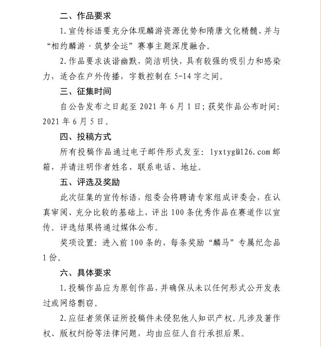 征集要求 1.宣传标语要充分体现麟游资源优势和隋唐文化精髓,并与“相约麟游,筑梦全运”赛事主题深度融合。