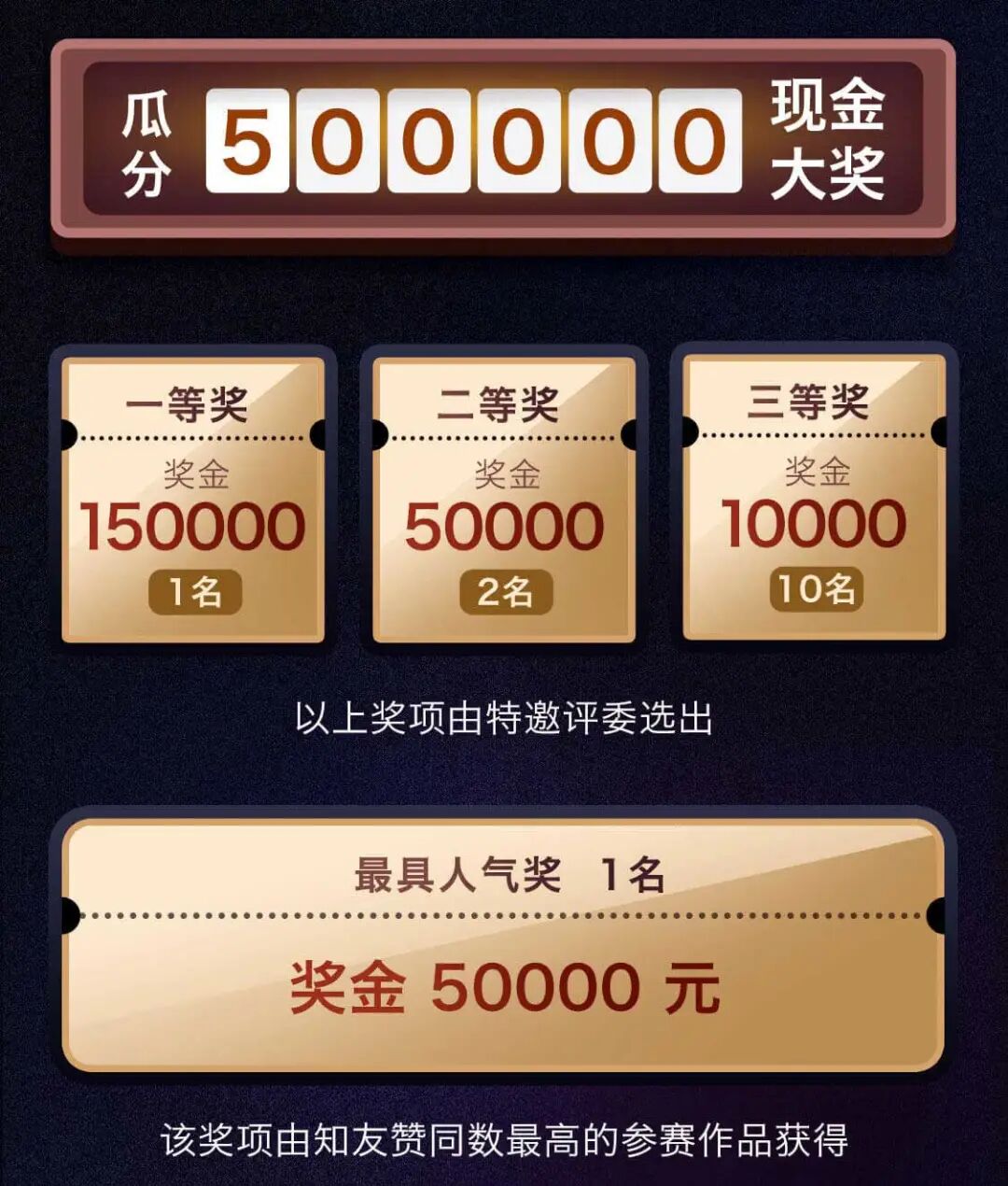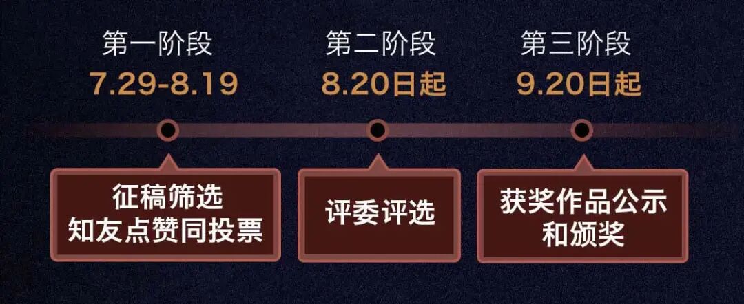 2.知友点赞同投票:2020 年 7 月 29 日 -- 2020 年 8 月 19 日,经筛选后,作品内容会在指定回答中展示,接受知友点赞同投票。截止 2020 年 8 月 19 日 23:59:59 ,赞同数最高的参赛作品将获得最具人气奖,奖金人民币 5 万元。赛后将公示和颁奖。